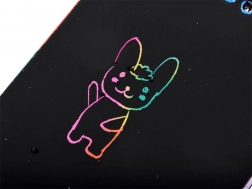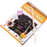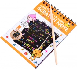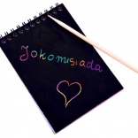 Kreatywny tęczowy notes A6 z czarnymi stronami, pod którymi kryje się barwne, tęczowe tło. Za pomocą drewnianego rysika dzieci łatwo tworzą obrazki, wzory i wiadomości. Idealny w podróży, do szkoły i do domu, wspiera rozwój wyobraźni i motoryki małej.