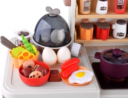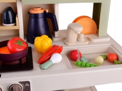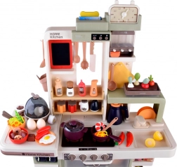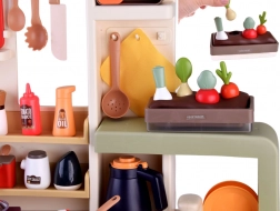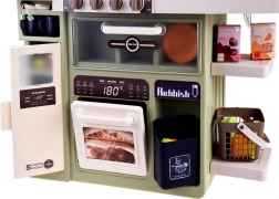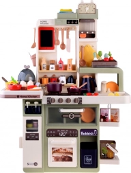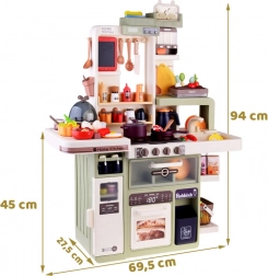 Duża dziecięca kuchnia z bogatym wyposażeniem zapewni małym kucharzom realistyczną zabawę. Nie brakuje efektów świetlnych i dźwiękowych, bezpiecznej pary podczas „gotowania”, działającego kranu z wodą w obiegu zamkniętym oraz mnóstwa kuchennych akcesoriów (88 szt.). W zestawie także okap LED z melodiami, kuchenka, piekarnik, lodówka, zmywarka oraz tablica kredowa na menu.
