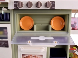 Ta przestronna plastikowa kuchnia w nowoczesnych kolorach zachwyci każde dziecko, które uwielbia zabawę w gotowanie. Realistyczne elementy, takie jak podświetlane palniki, dźwięki gotowania oraz bezpieczna para z palników, tworzą autentyczne wrażenia. Dzięki działającemu kranowi z obiegiem zamkniętym dzieci poćwiczą mycie naczyń i podlewanie „ziołek”.