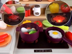 Po przekręceniu pokrętła palniki się podświetlają, rozbrzmiewają realistyczne dźwięki, a z palnika wydobywa się bezpieczna para – dokładnie jak podczas prawdziwego gotowania.