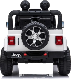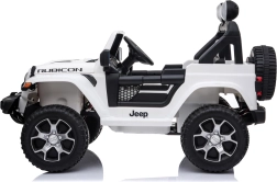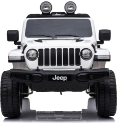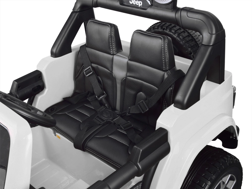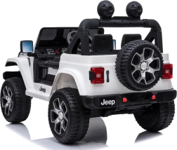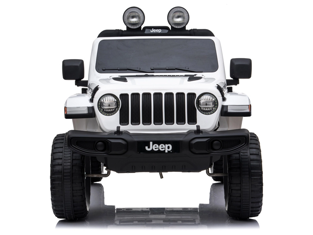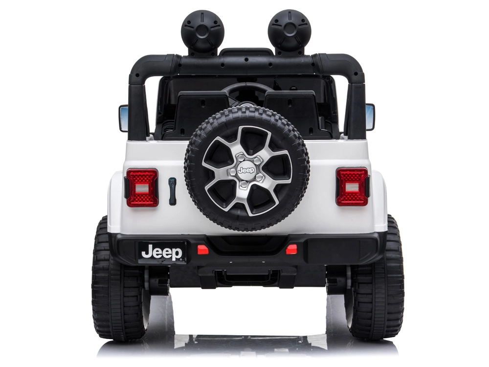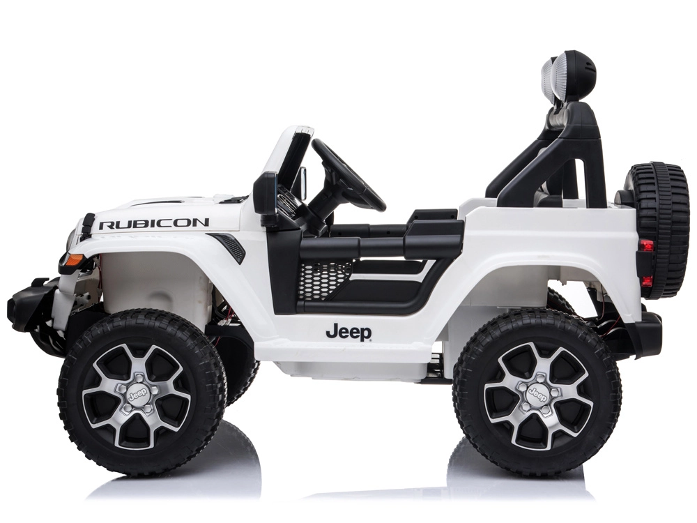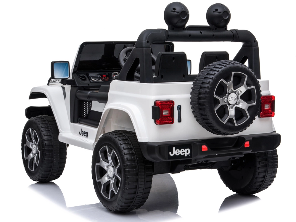 Licencjonowany samochodzik dla dzieci Jeep Wrangler Rubicon 4x4 z napędem na wszystkie koła oferuje 4 mocne silniki 45 W, akumulator 12 V/10 Ah, płynny start, miękkie koła EVA, otwierane drzwi oraz pięciopunktowe pasy. Można prowadzić pedałem lub za pomocą pilota 2,4 GHz z funkcją kontroli rodzicielskiej.