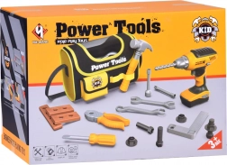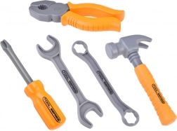 Zestaw zawiera młotek, klucze, śrubokręt, śruby, nakrętki oraz elementy konstrukcyjne – idealny do ćwiczenia małej motoryki i kreatywnego budowania.