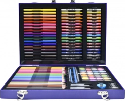 Wnętrze walizki zawiera szeroki wachlarz narzędzi plastycznych, które pozwolą realizować pomysły w różnych technikach. Zestaw obejmuje ołówki, pastele, flamastry, farby, pędzelek, linijkę, gumkę oraz temperówkę.
