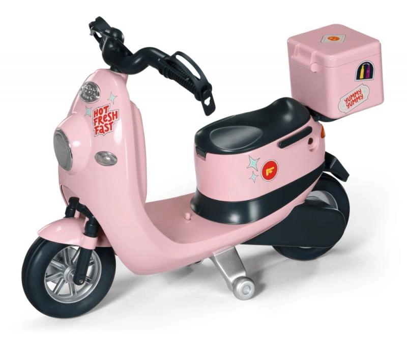 W zestawie znajduje się stacja „ładowania” do zabawy w uzupełnianie energii – po podłączeniu zapala się tylne światło (to nie jest prawdziwe ładowanie). Tylny schowek zapewnia miejsce na „dostawę” drobiazgów, naklejki uzupełniają wygląd skutera, a kółka stabilizujące zapewniają wygodną jazdę podczas zabawy.