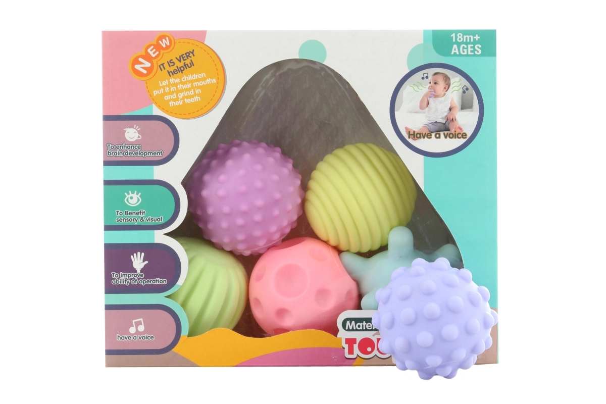 Zestaw piłeczek sensorycznych dla najmłodszych dzieci. Piłeczki mają różne kształty i kolory. Piłeczki są piszczące. Pakowane w pudełku. Wymiary opakowania ok. 21×18×7 cm. Wielkość piłeczki ok. 5–6 cm. Wiek 18m+