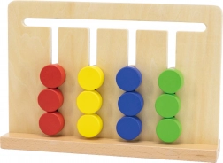 Przejrzysta tablica z czterema torami i dwunastoma klockami wspiera systematyczne sortowanie, przesuwanie oraz planowanie właściwej kolejności kroków.
