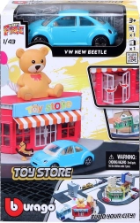 Zbuduj własne miasto z zestawem do zabawy Bburago City Sklep z zabawkami 1:43. Metalowy model auta w skali 1:43, plastikowy budynek z ruchomymi drzwiami, elementy uliczne i chodnikowe oraz różne akcesoria do kreatywnej zabawy. Zestaw można łączyć z innymi setami z serii StreetFire.