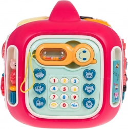 Wyjmowany telefon z cyframi oraz dźwiękami zwierząt i pojazdów, zębate kółka do ćwiczenia koordynacji oraz słoneczko z wiatraczkiem do odtwarzania melodii.