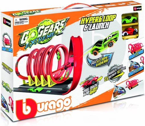 Autodrom Bburago GoGears Extreme: 6 pętli, rampa, 2 szybkie autka i zasięg do 25 m. W zestawie tarcza z punktacją. Dynamiczna wyścigowa zabawa dla dzieci.
