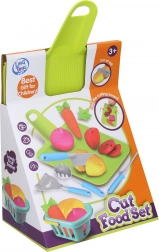 - Deska do krojenia, koszyk, rozkrojone marchew, pomidor, ziemniak, cebula, nóż, obieraczka, widelczyk, łyżka