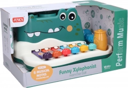 Odkryj zabawną i edukacyjną zabawkę w formie krokodyla do wbijania, która pełni także funkcję ksylofonu, w zestawie z młotkiem i trzema piłeczkami. Wymiary 25x16x12 cm.