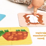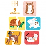 Te zabawne puzzle zapoznają dzieci ze znanymi domowymi pupilami. Każda czteroelementowa układanka przedstawia zwierzątko, co wspiera motorykę małą i spostrzegawczość.