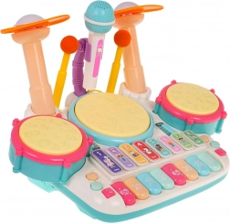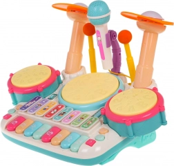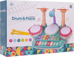 Interaktywny zestaw muzyczny, pianino z bębnami dla dzieci od 3 lat. Zabawka muzyczna wykonana jest z najwyższej jakości plastiku w żywych kolorach i wspiera dziecko w zabawie oraz nauce gry na instrumentach. Zabawka łączy instrumenty perkusyjne i pianino, jest wyposażona w mikrofon i system nagłośnienia. Klawisze generują brzmienia pianina, trąbki, gitary, odgłosy zwierząt oraz nazwy liczb. Trzy bębny i talerze rozświetlają się przy każdym uderzeniu pałeczkami. Dostępny jest także tryb nauki, w którym na bębnach zapalają się światła (pojedyncze, podwójne, potrójne – z różną prędkością), ucząc dziecko wystukiwania rytmów. Zabawka muzyczna ma regulację głośności oraz wejście na mikrofon, który jest częścią zestawu. Zasilanie: 4 baterie AA 1,5 V (brak w zestawie). . Funkcje zestawu: . - przeznaczone dla dzieci od 3 lat, .- wykonane z najwyższej jakości plastiku, .- bez ostrych krawędzi, .- żywe kolory przyciągają wzrok dziecka, .- podświetlane bębny i talerze, .- mikrofon z nagłośnieniem, .- tryby zabawy i nauki, .- dźwięki pianina, trąbki, gitary, zwierząt, liczb, .- regulacja głośności, .- wejście na mikrofon, . |
