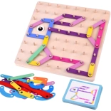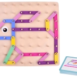 Kolorowe patyczki o różnej długości układa się na tablicy z kołeczkami według wzorów lub własnych pomysłów. Świetny trening motoryki małej i wyobraźni przestrzennej.