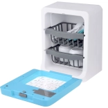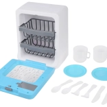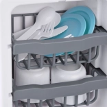 Ta dziecięca zmywarka wprowadza do zabawy realistyczne elementy: od szumu wody i dźwięku płukania/sterilizacji po sygnał zakończenia programu. Dzięki panelowi dotykowemu mali pomocnicy łatwo wybiorą tryb i czas. Otwierane drzwiczki oraz dwupoziomowe kosze umożliwiają wygodne wkładanie talerzyków, kubków i sztućców.