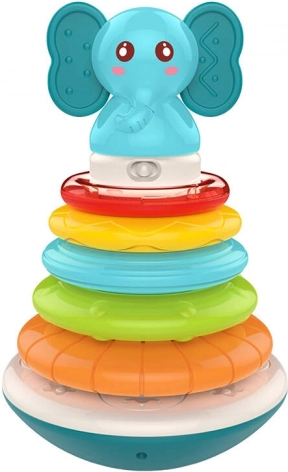 Interaktywna piramida oferuje wiele możliwości zabawy – od układania krążków, przez naciskanie słonika na górze, aż po kołysanie zabawki niczym tancerki. Dźwięki grzechotek, melodie, światła i wesołe odgłosy słonia zapewniają interaktywną zabawę. Dwupoziomowa regulacja głośności pozwala dostosować intensywność dźwięków.