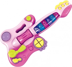 Gitara jest wyposażona w 9 przycisków, które uruchamiają różne melodie i dźwięki, oraz oferuje 3 tryby muzyczne - pop, rock i blues. Świecące przyciski, ruchomy wałek i różowa dźwignia do zmiany piosenek zapewniają dynamiczną zabawę, podczas gdy rozszerzająca się kulka działa jako grzechotka.