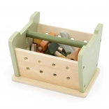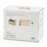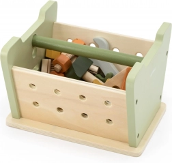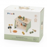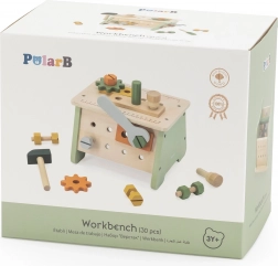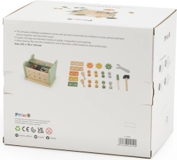 Drewniany zestaw Viga PolarB mini warsztat 2w1 ucieszy każdego małego majsterkowicza. Zawiera 21 elementów, w tym młotek, klucz, śrubokręt, śruby i nakrętki, kołki oraz kółka zębate. Stolik można odwrócić i zamienić w praktyczną skrzynkę do transportu i przechowywania. Zabawa naturalnie rozwija małą motorykę, kreatywność i wyobraźnię.
