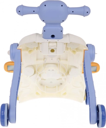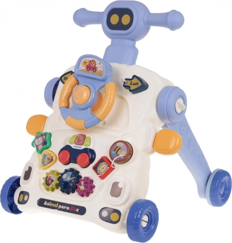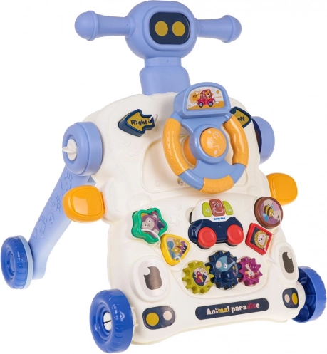 Ten wielofunkcyjny chodzik ucieszy rodziców i dzieci: służy jako podpora przy pierwszych krokach, a jednocześnie jako stolik z aktywnościami dla radosnego rozwoju. Panel oferuje kierownicę z gwizdkiem, przekładnie, sorter kształtów i mini kosz do rzucania piłeczką – wszystko zaprojektowane tak, aby wzmacniać koordynację, koncentrację i umiejętności motoryczne.