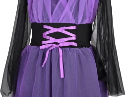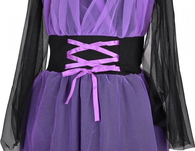 Od mień swoją małą elegantkę w tajemniczą czarownicę. Sukienka w czarno‑fioletowej kolorystyce z przewiewną warstwą tiulu i dekoracyjnym sznurowaniem na gorsetowej części tworzy wyrazisty, a jednocześnie wygodny kostium. Lekka tkanina przyjemnie się nosi i nie ogranicza ruchów, dlatego świetnie sprawdzi się na całonocną zabawę.