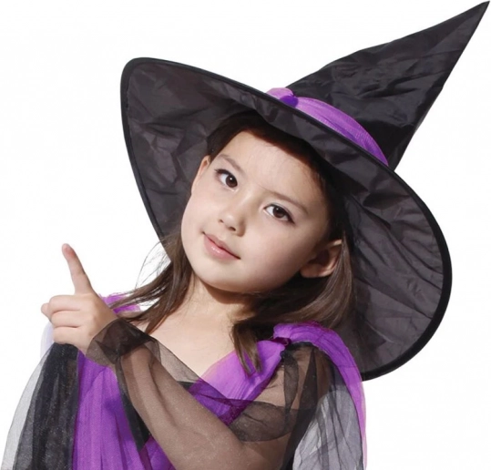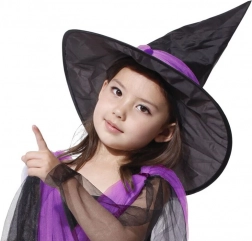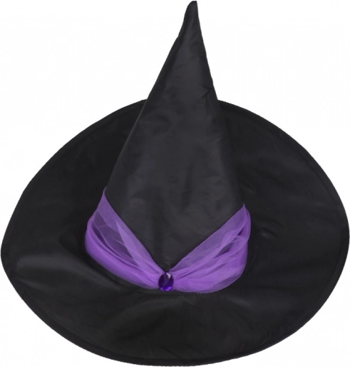 Klasyczny czarny kapelusz z fioletowym zdobieniem doskonale uzupełnia kostium i podkreśla czarodziejski klimat.
