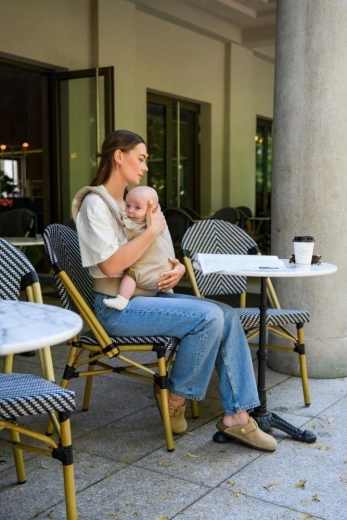 Dziecko można nosić z przodu (od ok. 3 miesięcy) dla maksymalnego kontaktu z klatką piersiową lub na plecach (zazwyczaj od ok. 6 miesięcy) dla większej swobody ruchu. Odpinany kaptur chroni przed wiatrem i słońcem, a także podpiera główkę podczas snu. Oddychająca, hipoalergiczna tkanina jest delikatna dla skóry i zapewnia komfort także w cieplejszej pogodzie.