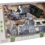 - Kompletne wyposażenie: pojazd, śmigłowiec, łódź, wieża, broń, pies i 2 figurki żołnierzy