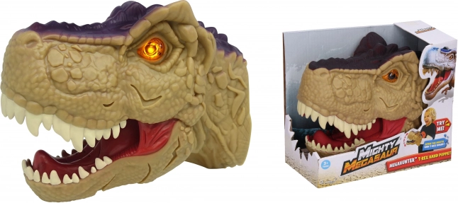Głowa dinozaura z efektami na rękę 20 cm. Dźwiękowe i świetlne efekty, baterie w zestawie. Idealna zabawa dla dzieci.
