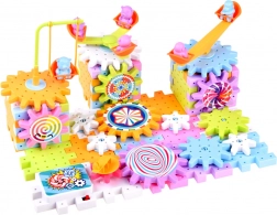 Zestaw do złożenia zawiera zębatki i małe łopatki z figurkami zwierząt, które mogą się obracać, co rozwija koordynację i zdolność rozwiązywania problemów.
