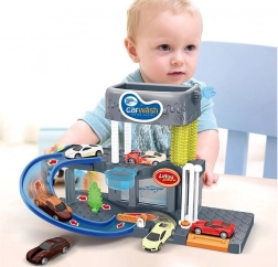 Winda płynnie przenosi autka na górny poziom do mycia, a potem z powrotem do suszenia. Dwupoziomowa konstrukcja zapewnia więcej akcji i rozwija motorykę małą.