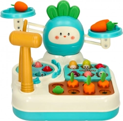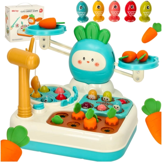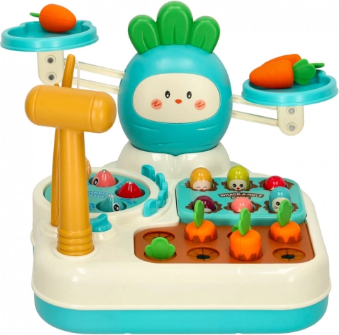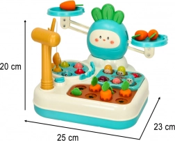 Waga z miseczkami, gra w kretka z młotkiem, mini gra w łowienie rybek oraz wyciąganie marchewek – zabawa, która szybko się nie znudzi.