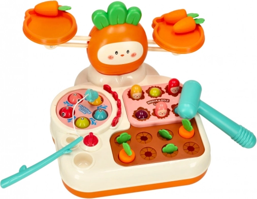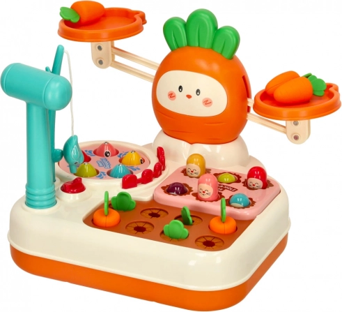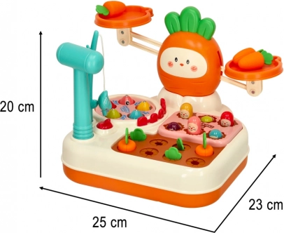 Ten interaktywny zestaw zamienia naukę w zabawę. Dzieci wypróbują równowagę i porównywanie masy na wadze szalkowej, poćwiczą spostrzegawczość i precyzję podczas łowienia rybek, wzmocnią siłę chwytu i szybkie reakcje w zabawie w krecika z plastikowym młoteczkiem oraz rozwiną cierpliwość i logiczne myślenie przy sadzeniu i zbieraniu marchewek.