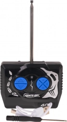 Steruj swoją rybą łatwo i intuicyjnie za pomocą czarnego i niebieskiego pilota z anteną i dwoma jasno niebieskimi przyciskami sterującymi.