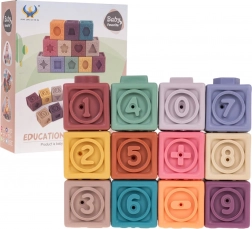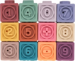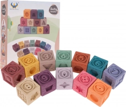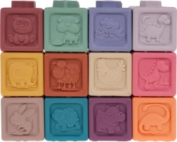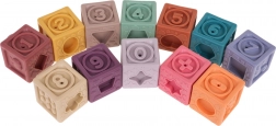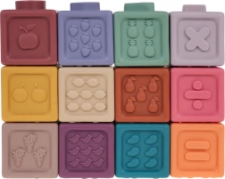 Zestaw zawiera 12 kolorowych silikonowych kostek, które stymulują wzrok oraz rozwijają kreatywność dzieci.