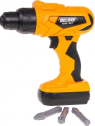 Realistyczna wiertarka wkręca i wykręca, wydaje dźwięki, ma wymienne bity (płaski, krzyżowy, wiertło) oraz odłączany „akumulator”. Zasilanie: 2× AA 1,5 V (brak w zestawie).