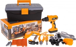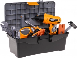 Ten dziecięcy zestaw narzędzi oferuje wszystko, czego potrzebuje mały majsterkowicz: dużą skrzynkę na narzędzia, okulary i maskę ochronną, młotek, śrubokręt, szczypce, klucze oraz elementy konstrukcyjne ze śrubami i kołkami rozporowymi. Dzięki wysokiej jakości plastikowi zestaw jest lekki, wytrzymały i idealny do zabawy w profesjonalistów.