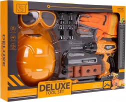 Bogato wyposażony dziecięcy zestaw narzędzi dla małych majsterkowiczów od 3 lat zawiera kask, gogle, rękawice, młotek, śrubokręt, śruby i płytki oraz interaktywną wkrętarko-wiertarkę akumulatorową z dźwiękami na 2× AA (brak w zestawie). 20 elementów z bezpiecznego plastiku wspiera wyobraźnię i małą motorykę.
