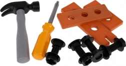 Młotek, śrubokręt, śruby, płytki z otworami i inne akcesoria otwierają przestrzeń do swobodnego budowania, treningu małej motoryki i rozwijania wyobraźni.