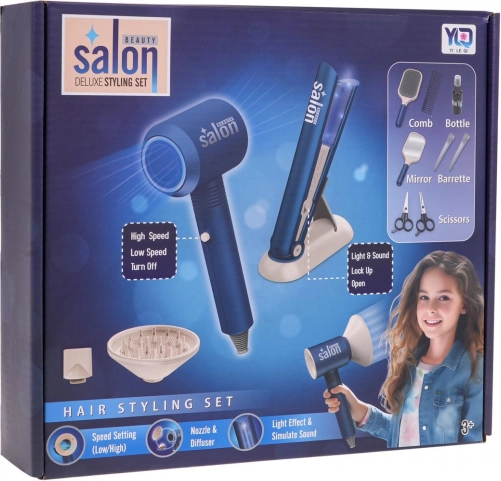 Zestaw wyposażony jest w specjalne akcesoria. . | Interaktywny, dobrze wyposażony zestaw fryzjerski z suszarką z wymiennymi nasadkami oraz prostownicą na baterie jest przeznaczony dla dzieci od 3 lat. Zestaw zawiera szeroką gamę narzędzi fryzjerskich, w tym suszarkę, prostownicę do włosów, nożyczki, grzebienie i inne akcesoria. Suszarka do włosów wydmuchuje strumień powietrza. Ma dwustopniową regulację nawiewu i podczas suszenia wydaje dźwięki jak prawdziwa. Prostownica do włosów ma efekty świetlne, a towarzyszące prostowaniu dźwięki uatrakcyjniają zabawę. Suszarka jest zasilana 3 bateriami AAA 1,5 V (brak w zestawie), prostownica 2 bateriami AAA 1,5 V (brak w zestawie). .. Funkcje zestawu: . - odpowiedni dla dzieci powyżej 3 lat, .- wykonany z najwyższej jakości materiałów, .- suszarka z wymiennymi nasadkami (dyfuzor i koncentrator), .- suszarka wydmuchuje strumień powietrza, .- suszarka ma dwustopniową regulację nawiewu, .- suszarka wydaje dźwięki podczas suszenia, .- prostownica ma suwak do zamykania i otwierania, .- prostownica ma podświetlenie, .- prostownica wydaje dźwięki charakterystyczne dla prostowania włosów, .- praktyczna podstawka na suszarkę lub prostownicę. . |