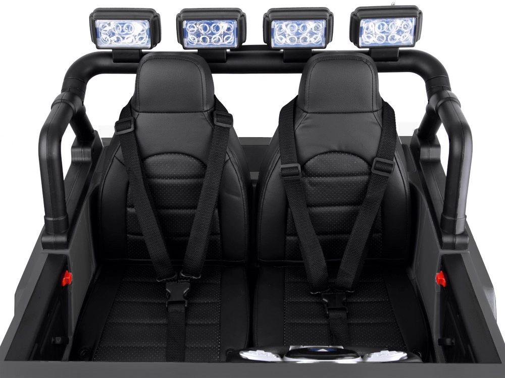 Miękkie koła EVA, dwuosobowe skórzane siedzisko, światła LED oraz panel multimedialny z radiem, melodiami i USB dbają o zabawę i wygodę.