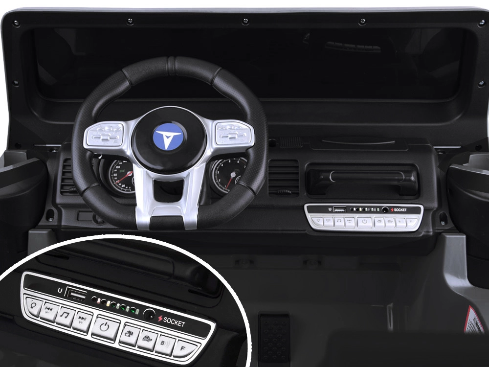 Panel multimedialny oferuje radio, wgrane melodie i wejście USB na własną muzykę. Przełącznik kierunku jazdy (przód/stop/tył), dwie prędkości oraz wydajne światła LED z przodu i na pałąku zapewniają zabawę w dzień i wieczorem. Miękkie koła EVA i napęd 4x4 radzą sobie z trawą, nierównościami i łagodnymi wzniesieniami.
