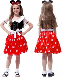 Uroczy dziewczęcy kostium z czerwoną spódniczką w białe groszki i czarnym gorsetem z białym kołnierzykiem jest idealny na karnawał, urodziny i szkolne występy. W zestawie znajduje się także opaska z uszkami i kokardą, która dopełnia cały wygląd. Kostium jest wygodny w noszeniu, łatwy do zakładania i wspiera wyobraźnię, kreatywną zabawę oraz radość z przebierania.