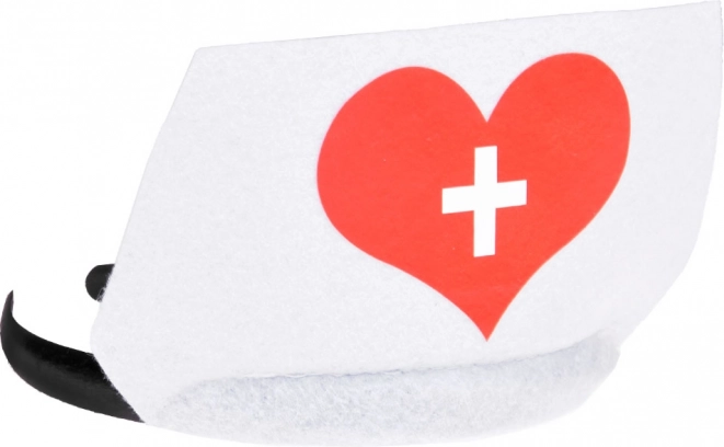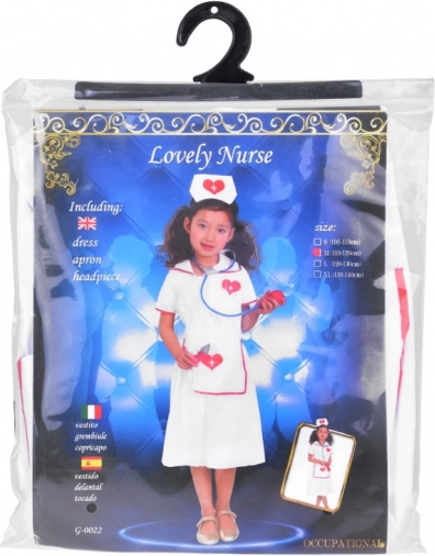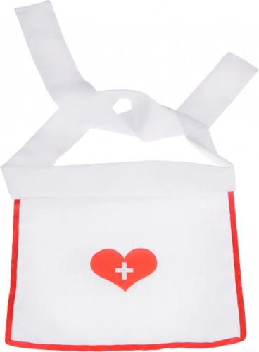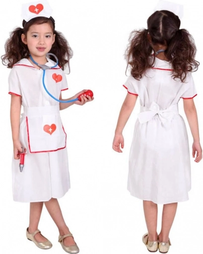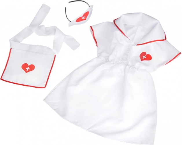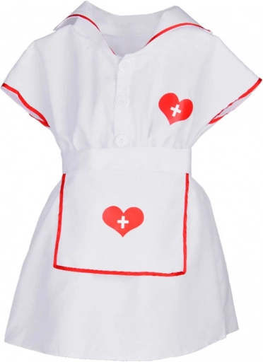 Biała sukienka z czerwonymi lamówkami, serduszka z krzyżem i fartuszek tworzą klasyczny wygląd pielęgniarki, który dzieci uwielbiają.