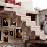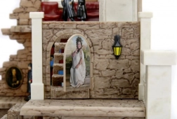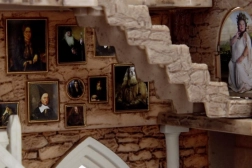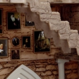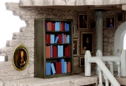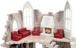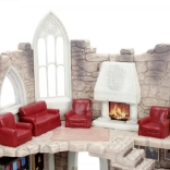 Mały model pomieszczenia z antycznym kamieniem i gotyckimi łukowatymi oknami. Czerwone fotele wokół kominka podkreślają gotycki styl.