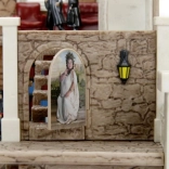 Kamienna miniatura zamku z filarami i małą zewnętrzną lampą, odpowiednia do wystawienia lub zabawy.