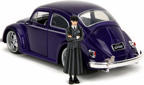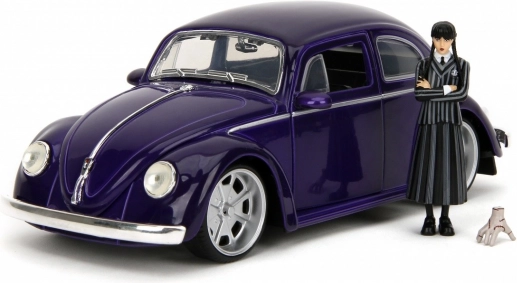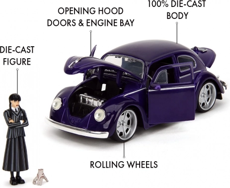 Oficjalnie licencjonowany zestaw kolekcjonerski od Jada Toys zawiera ikoniczny Volkswagen Beetle (1972) w skali 1:24 oraz figurkę Wednesday Addams wraz z Rączką (Thing). Metalowe wykonanie z otwieranymi drzwiami, maską i klapą silnika, gumowe opony i precyzyjne detale gwarantują świetne wrażenia z ekspozycji i zabawy. Idealny dla fanów serialu Wednesday oraz kolekcjonerów od 8 lat.