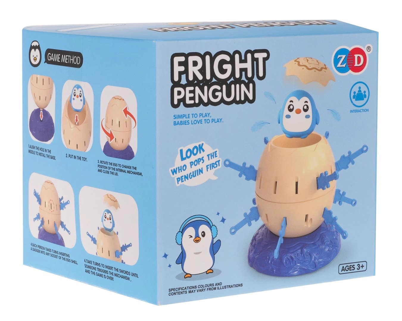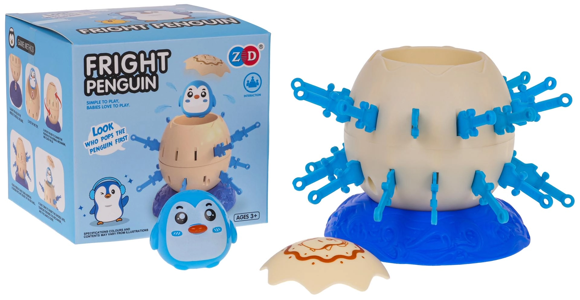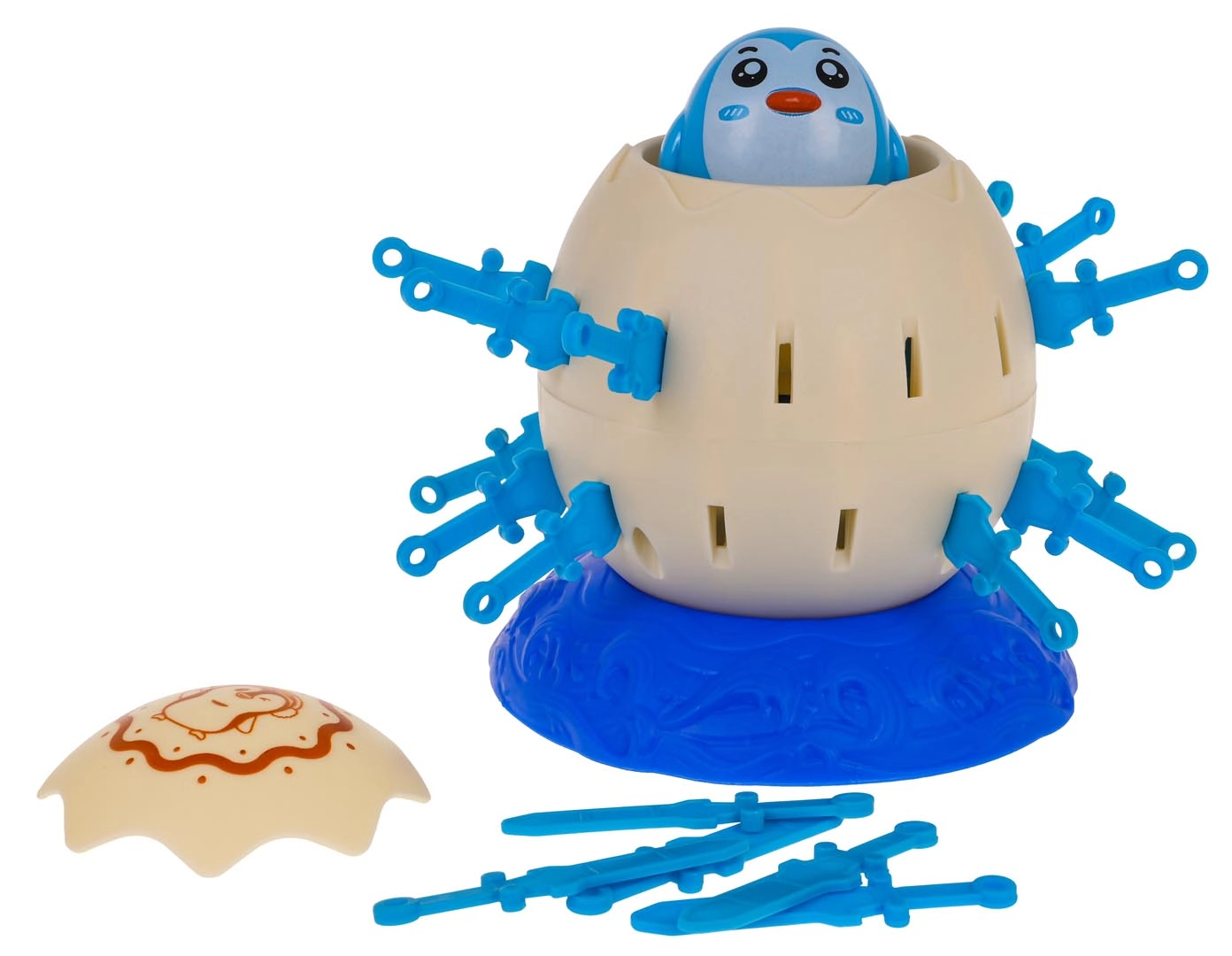 W opakowaniu znajdziesz podstawkę, jajko z otworami, górną część, figurkę pingwina oraz 24 plastikowe miecze.
