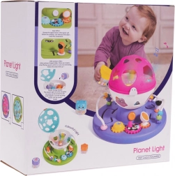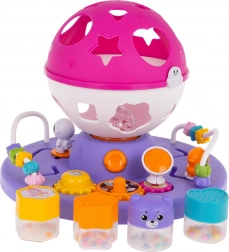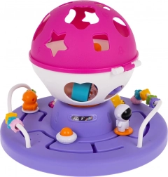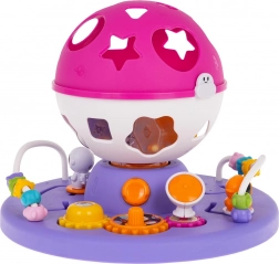Ten kolorowy sorter z kulistą górną częścią i kosmicznymi akcentami oferuje dzieciom wiele sposobów na odkrywanie i naukę. Podstawa kryje zębatki do obracania, małe labirynty i przekładnie, a okrągły sorter pomaga poprawnie dopasowywać kształty. Po włożeniu wszystkich elementów kulę można otworzyć i zacząć od nowa – idealne do wielokrotnej zabawy.