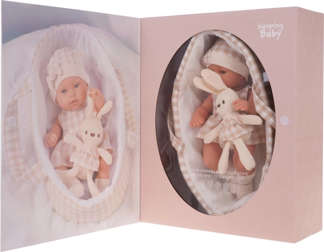 - lalka–niemowlę, przenośny tekstylny koszyk z uchwytami, pluszowy króliczek, opakowanie prezentowe