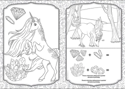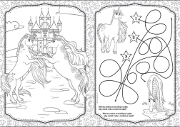 Kolorowanka zawiera 16 czarno-białych stron z obrazkami do pokolorowania i ulubionymi aktywnościami.